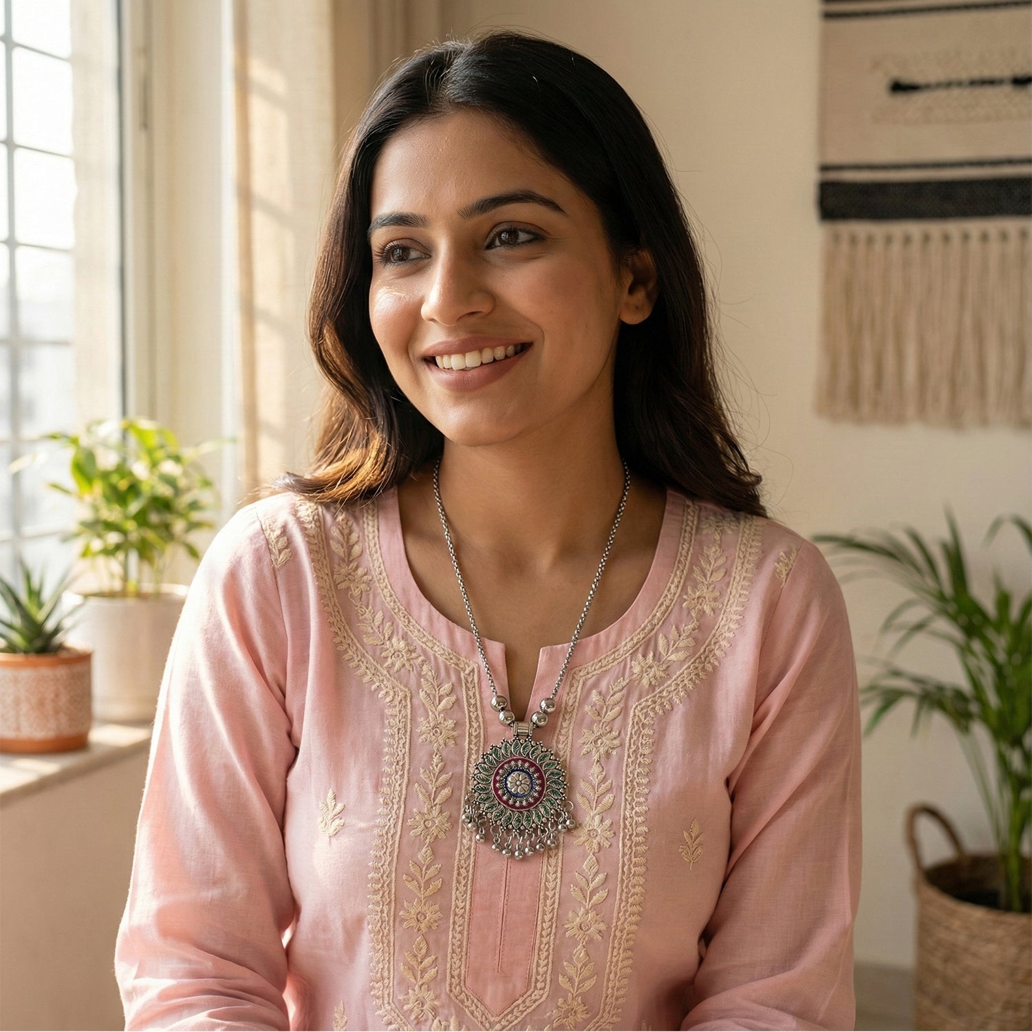 This beautifully crafted antique silver-tone oxidized pendant necklace showcases a detailed floral mandala design highlighted with vibrant enamel accents and intricate metalwork. The circular pendant is adorned with delicate hanging ghungroo-style beads that add movement and traditional charm. Paired with a sturdy beaded chain, this necklace blends classic ethnic aesthetics with a contemporary statement appeal. Ideal for enhancing traditional outfits and fusion wear, it brings an artistic and handcrafted touch to festive and cultural looks. A timeless imitation jewellery piece designed to elevate your ethnic jewellery collection.